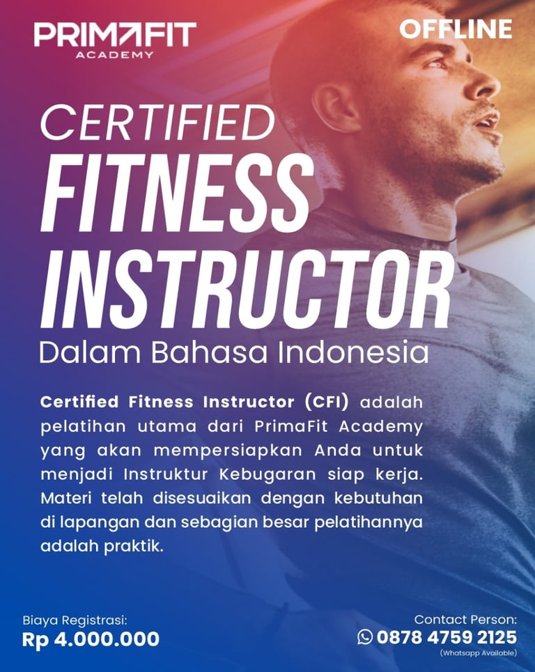 Certified Fitness Instructor (CFI) adalah pelatihan utama dari PrimaFit Academy yang akan mempersiapkan Anda untuk menjadi Instruktur Kebugaran siap kerja. Materi telah disesuaikan dengan kebutuhan di lapangan dan sebagian besar pelatihannya adalah praktik.